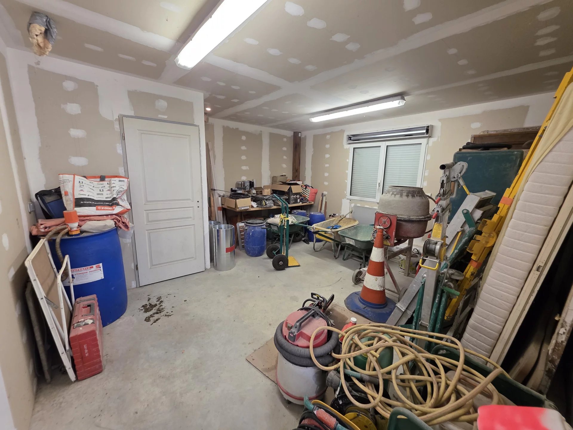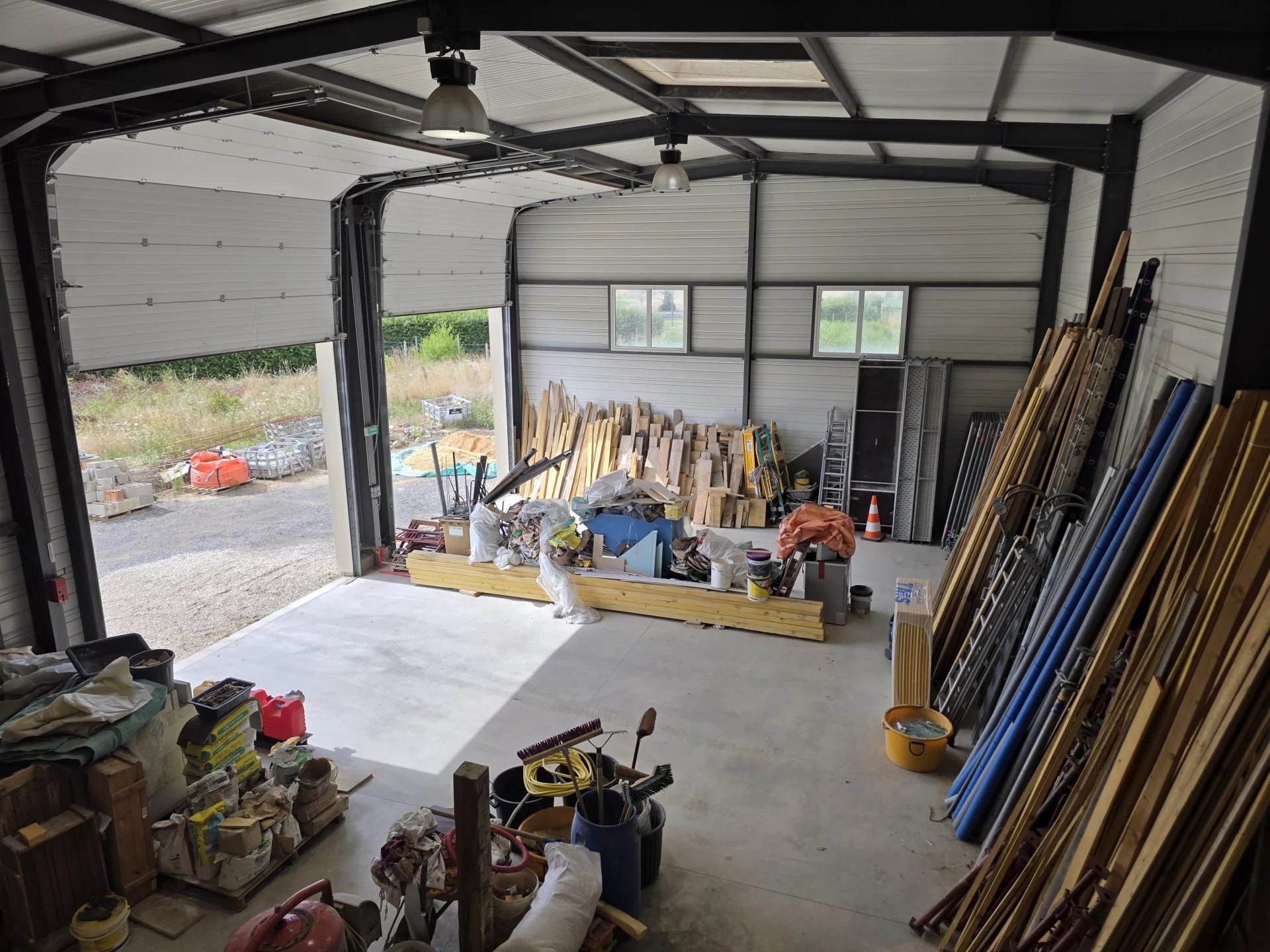 D’un vaste garage adapté aux véhicules utilitaires et matériels de chantier avec ses deux grandes portes sectionnelles.